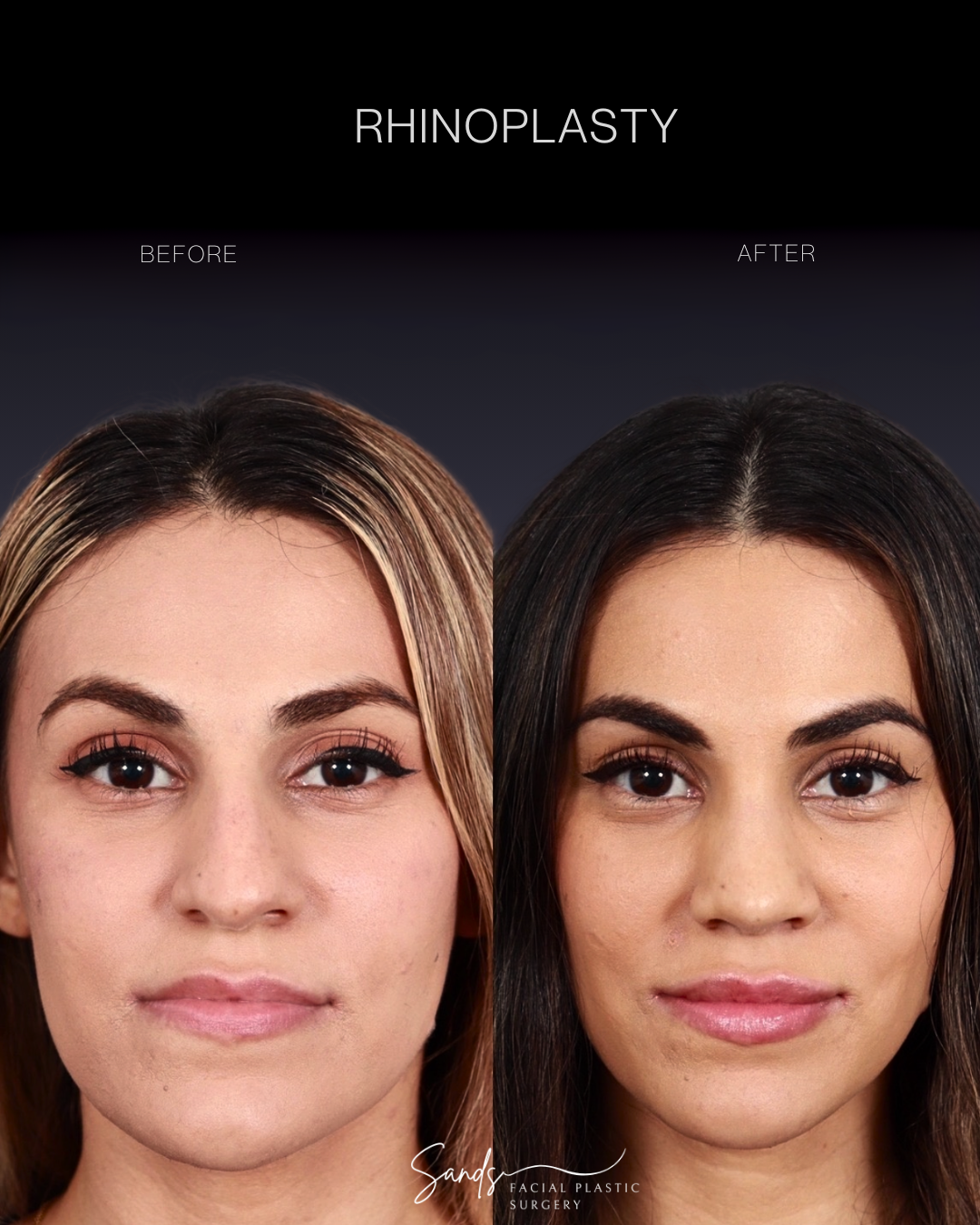Rhinoplasty: Here is another transformative result going from a nose that dominates the face to one that balances harmoniously with her other features and remains true to her identity. Functional issues were addressed at the same time to improve breathing while still allowing the nose to be made smaller.
