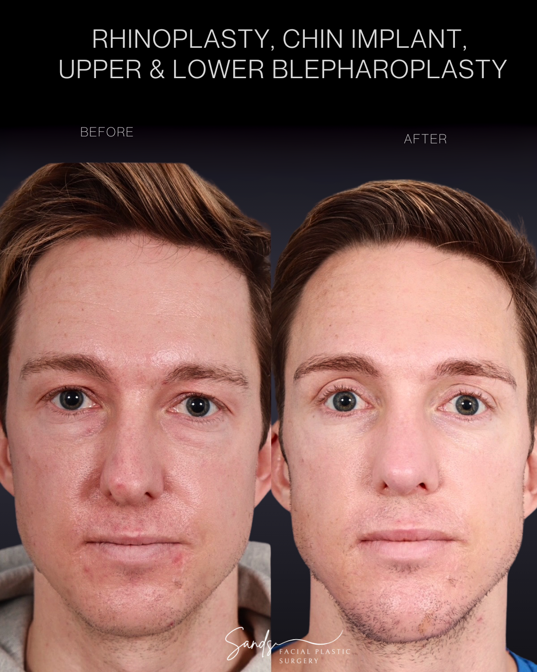 Case 30: The goal here was to enhance overall facial proportions by improving the relationship between the nose and chin. Narrowing of the nose and squaring of the chin on front view combined with hump reduction and projection of the chin on profile view all helps to create a more balanced facial aesthetic while strengthening masculine features.